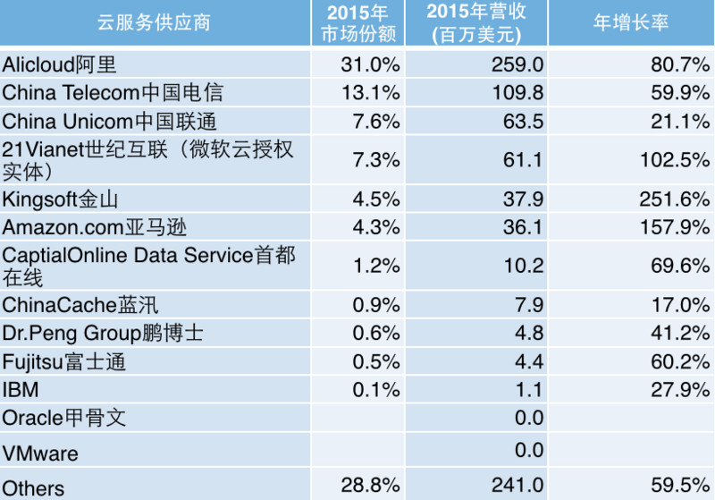 值得一提的是,亞馬遜作為外來者,IaaS市場(chǎng)的增長(zhǎng)速度和占有率也頗為驚人,2015全年增速達(dá)到了157.9%,4.3%的市場(chǎng)份額緊隨金山云,排在了第六位。